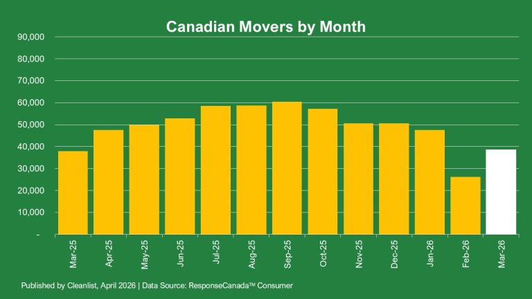 Canada recorded 38,419 mover households in March 2026, a strong rebound from 26,204 in February, as completed moves begin catching up with earlier listing activity.